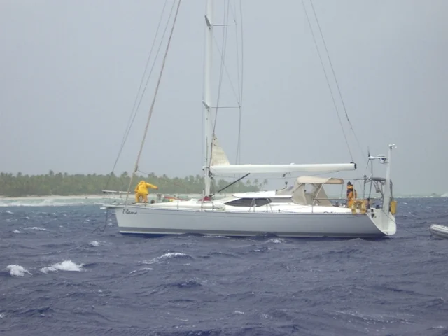 The weather continued to blow and we stayed on the boat for four days just in case something happened. Our host families would come through the pass with bread, fish and DVD’s for us to watch. Thankfully there were no more incidents apart from a yacht breaking one of their lines (everyone had two lines as a minimum). By Thursday, the wind had dropped to 20 knots and we decided to go to shore to visit our host family. Although the wind had dropped there was still talk that the swell was any where from 4m to 7m. As the weather was not getting any better the following week, we decided that we would make a run for it the following day. We had a lovely lunch and said a sad farewell to Bill and Mitze. We got back to anchor and found, with the exception of “Kind of Blue” that the others had gone. We had decided to have a good night sleep and make some passage good before heading off. As it was, the afternoon we returned to the boat, a number of big squalls went through so we were relieved that we did not follow. As for the passage, it was ok. We managed to miss all the squalls as they seemed to go straight around us. The swell was approx 4m to 5m with the waves coming from behind. If you didn’t look at the waves and ignore the constant rocking, you could just about forget you were at sea…well nearly!!